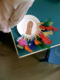On the weekend I swung by Daiso, the Japanese version of the dollar store (although everything there is $1.50), and found miniature clothes pins, then got into school early on the Monday before our Thanksgiving break to manufacture 150 clothespin feathers using my handy-dandy glue gun. It was about the time I'd completed this task that it became clear that school was going to get snowed out. In fact, we were snowed out for the rest of the week, leaving me with an actual Thanksgiving craft on my hands and no little hands to undertake it.