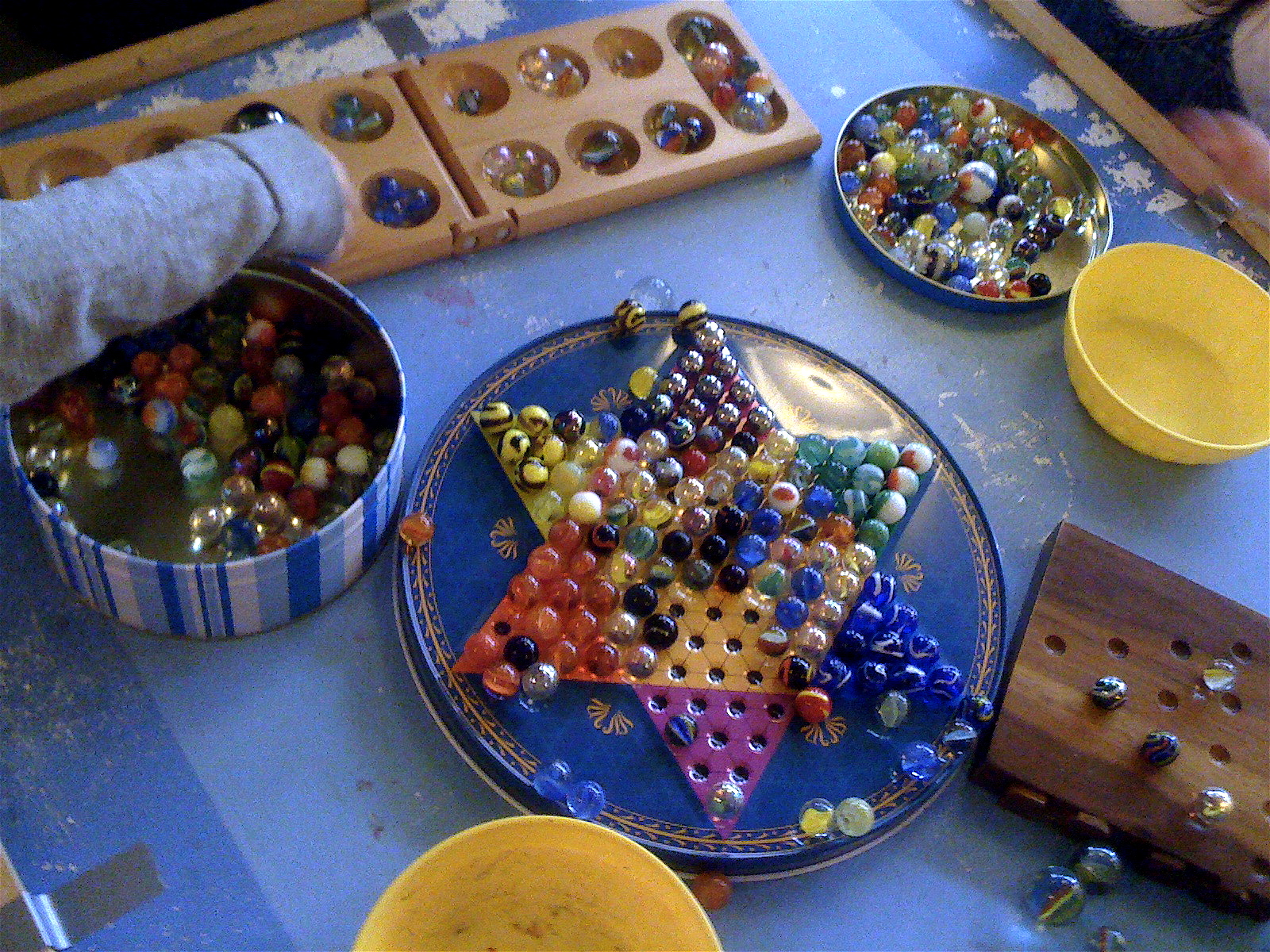 Anything, really, with enough variety that it can be arranged, classified, and sorted. If you look carefully at the marbles on this old Chinese checkers star, for instance, you'll see a number of sets taking shape on the points. Or how about the marbles on this triangular game board?