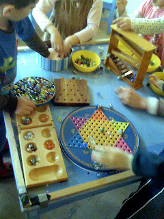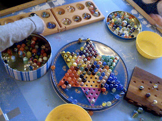 Despite a classroom in which we were playing with a giant pendulum in one corner and painting pendulums in another, despite a sensory table of water, funnels and hardware store tubing, one of the places in our classroom where the children most congregated last week was our small "blue table," upon which our marble collection resided.