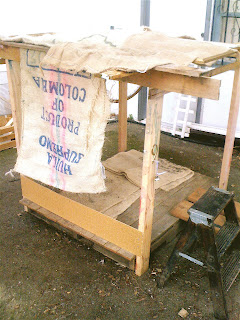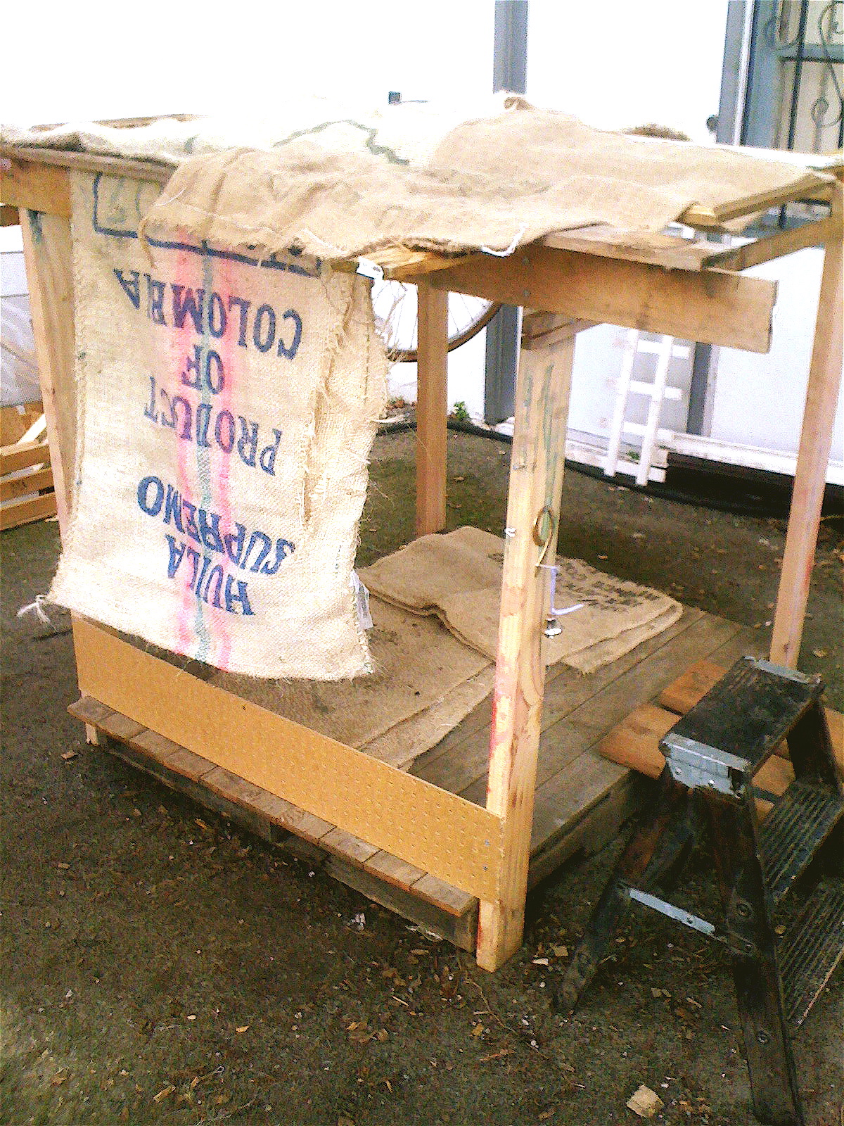 This is where we started last April, a simple floor constructed from a shipping pallet and discarded fencing planks, some 2 X 4's on the corners, some more fencing planks across the top for stability, and burlap bags temporarily serving as roof and walls.