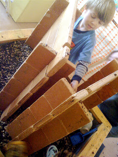 We had coffee factories, construction sites and all kinds of over, under, through, and around play going on in there, not to mention the opportunity for more quiet, meditative moments than our sensory table normally provides. And there's a lot more to explore here, both in terms of the use of dividers and materials, as well as over on Tom's blog. What a great new window into the world of sensory play.