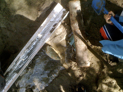 The first thing we had to do was dig a hole for the cistern. I'd brought out the adult shovel, figuring we might need more "fire power" than those little plastic ones the kids use.