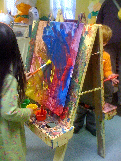 For instance, a child is painting at an easel, exploring color, shape, and motion, experimenting with brushes, paper, and paint. There is an adult watching over her shoulder who points and asks, "What color is that?"
