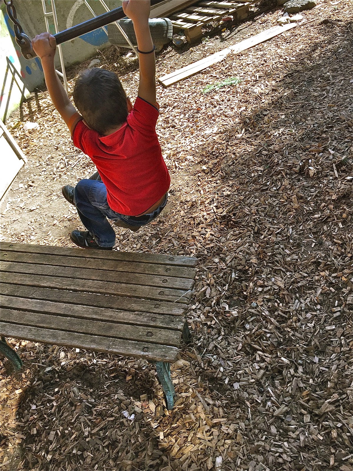 This boy wanted to reach the trapeze bar. Instead of asking me to lift him up, he wrangled a table into position, climbed on it, then stood there for a long time holding the bar. I think it could have gone either way. Twice he released the bar as if to climb back down, but finally, after much thought, he let himself go, swinging wildly for a moment, then letting himself drop to the ground in triumph.