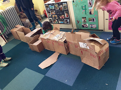 On Monday, the next day we got together, I brought the rest of the dozen or so boxes into the room. I said, "We need to unpack the rest of these boxes." When one of the kids suggested they would need the box cutter, I showed the sharp blade to them again. Some of them thought they could use it safely, but there were others who said they would rather that their classmates not be wielding sharp knives around them. "We'll just use our hands." And that's what they did, tearing into the boxes in groups of two and three, using their fingernails, teamwork, and ingenuity.