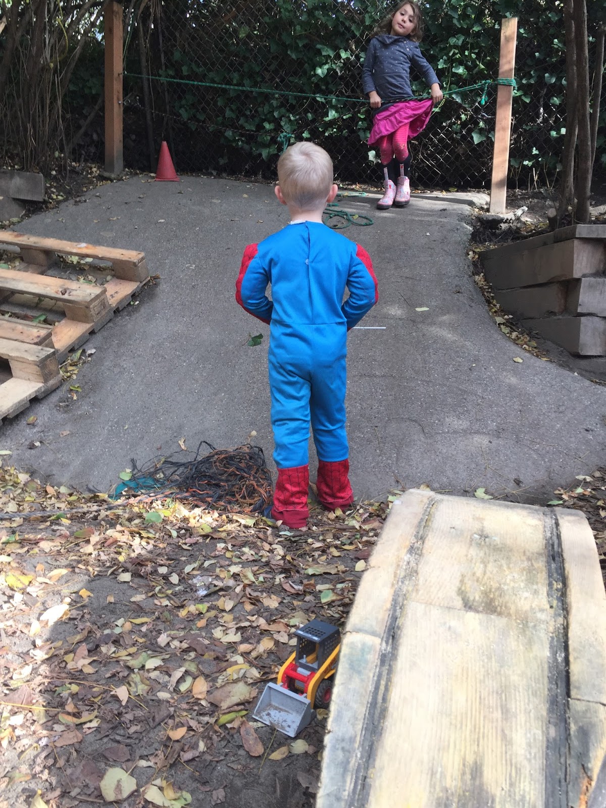 I've written before about our 4-5's class and their superhero games. There is a core group of kids who arrive each day ready for that and nothing else. They've begun making plans even before they arrive, often choosing a particular costume or t-shirt or jacket, sometimes even having come up with a story line. We begin our days outdoors and the first of the superheroes to arrive generally mill about as they await their fellow superheroes. Sometimes they can't wait for their friends and start with me, detailing who they are, what powers they have, and what bad guys they will defeat. As friends arrive however I'm forgotten in the urgency of organizing their game: