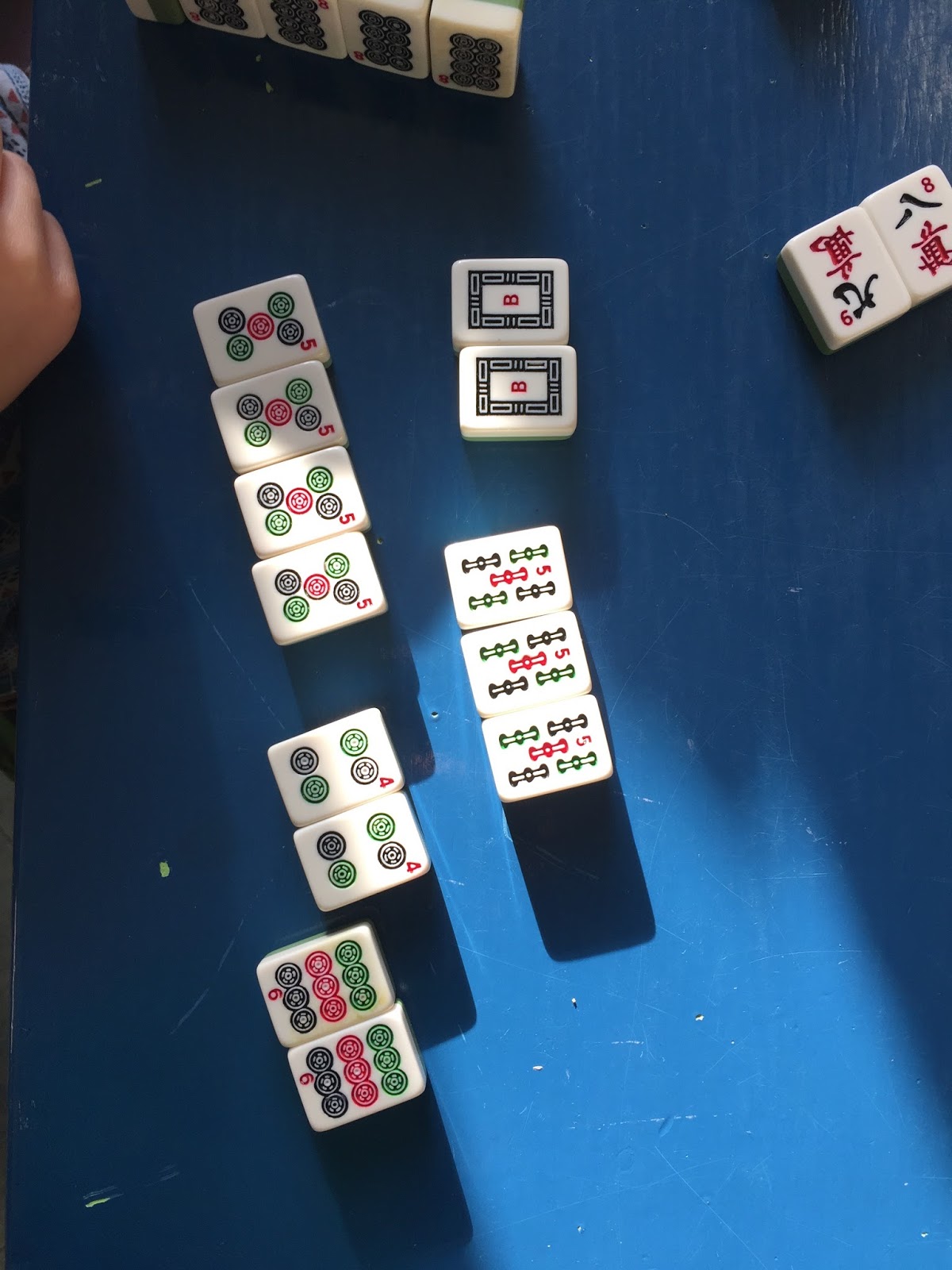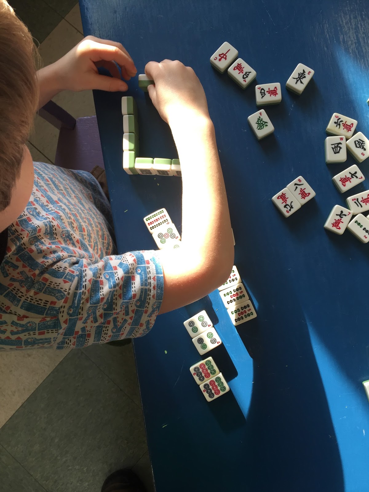 Several weeks ago, we were playing with our Mah Jong tiles. We don't play the actual game because I don't think any of us know how, but I trot them out every now and then because they come in a nice little case and the smooth, heavy game pieces are a pleasure to handle. There are always a few kids who take an interest in them, often building small table top structures, but they are even more often left alone for long stretches of our days together. At one point I passed the unoccupied table where I'd put them to start the day to find that one of the kids had arranged them purposefully. I hadn't seen who had done it, but they had apparently been studying the markings and had played a quiet matching game.