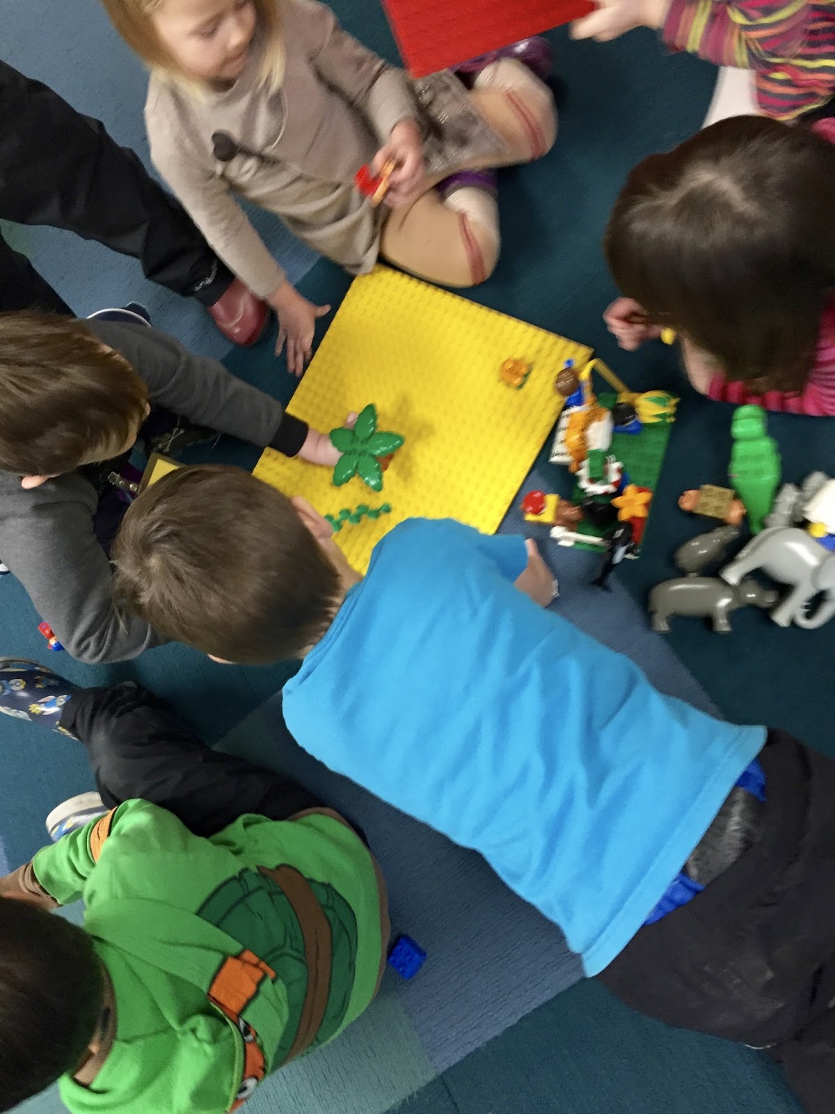 I've always viewed these types of games as a kind of every day miracle. Only a few months ago, this would have been nearly impossible for most of these three and four year olds, to sit down together like this, to not be tempted by the urge to destroy, but rather to gather around on our bellies and knees and negotiate a story together. They may strongly assert the parts of the story that are about themselves like, "I'm the dinosaur!" but when it comes to the shared parts, their sentences tend to turn into questions and invitations as they look for agreement and participation from the rest of the kids.