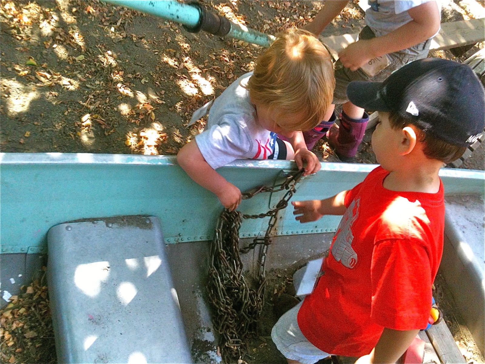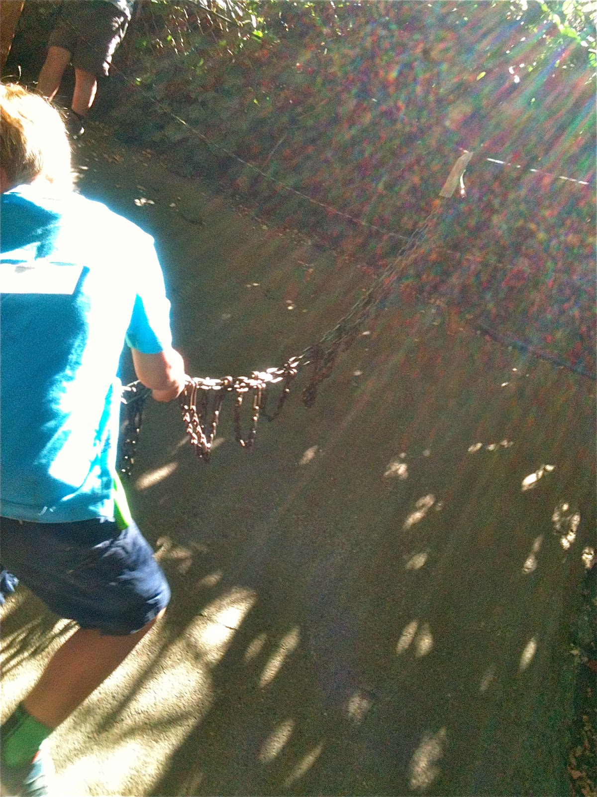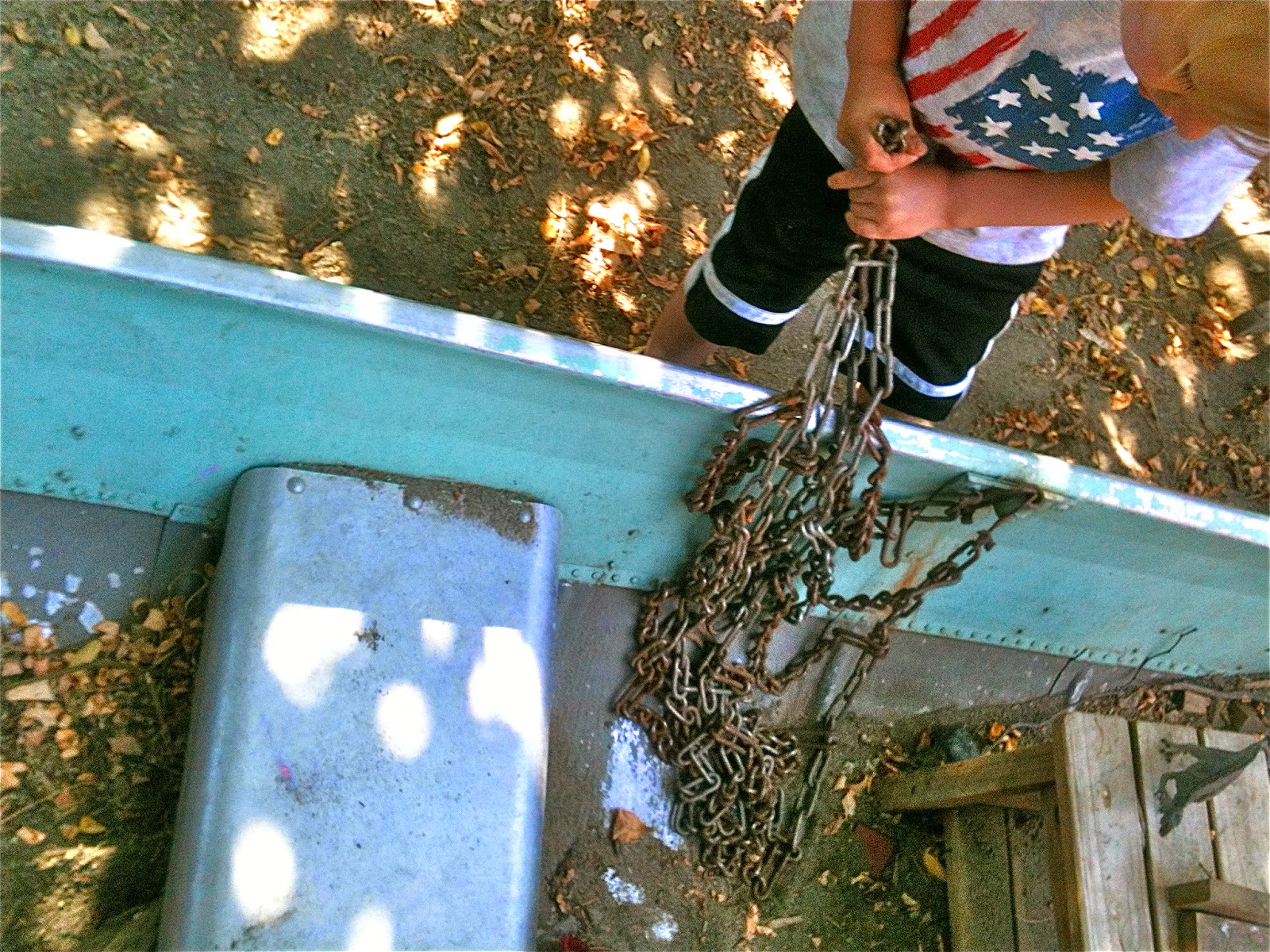 After taking his turn on the seesaw, one child started monkeying around with the heavy, unwieldy chain.