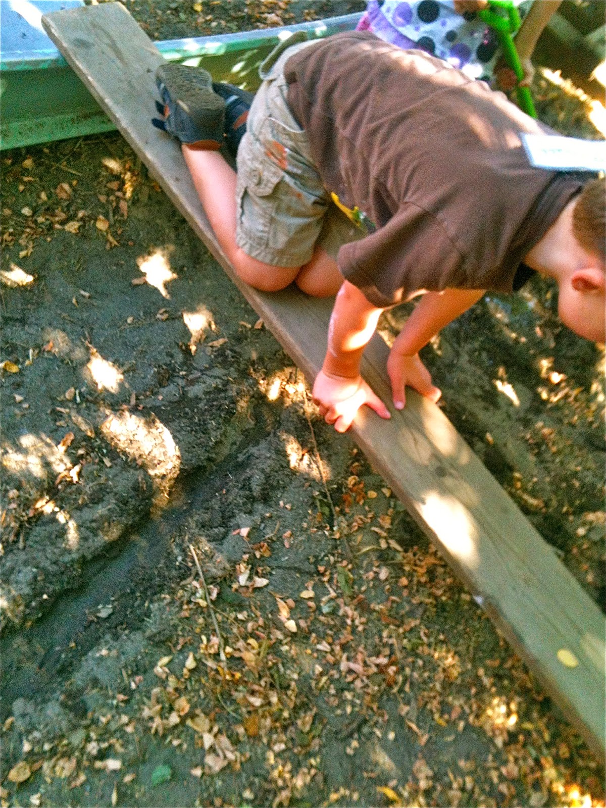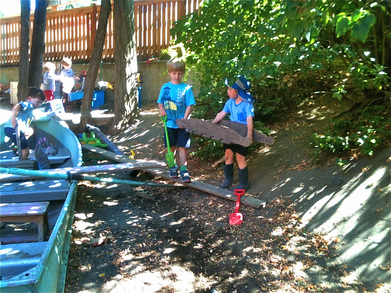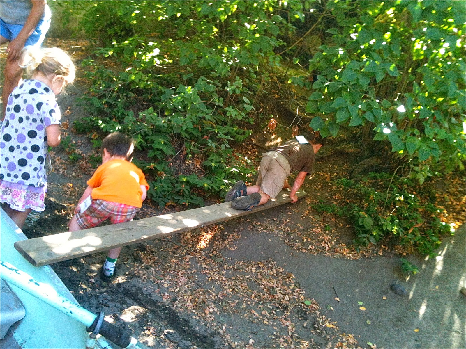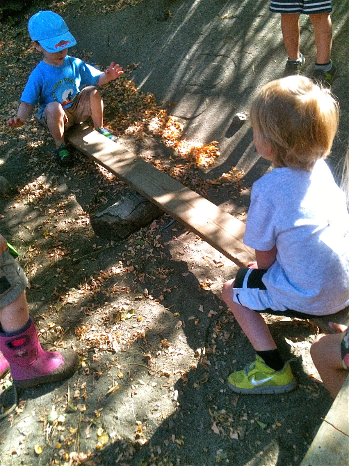 One afternoon, we dragged a plank over beside the sand pit boat and after some negotiation, made one of Woodland Park's patented seesaws by using a log as a pivot. We've been making these for three years now, a piece of institutional knowledge that continues to be passed down among the children.