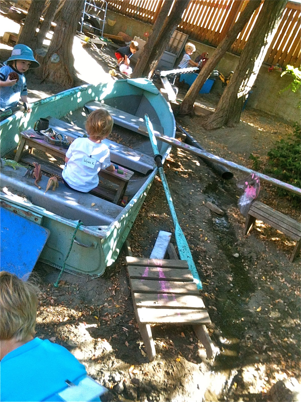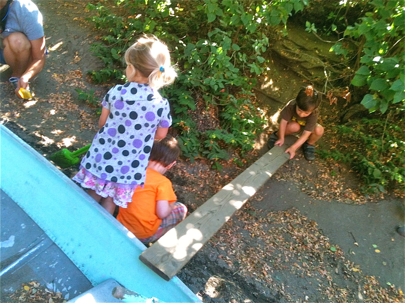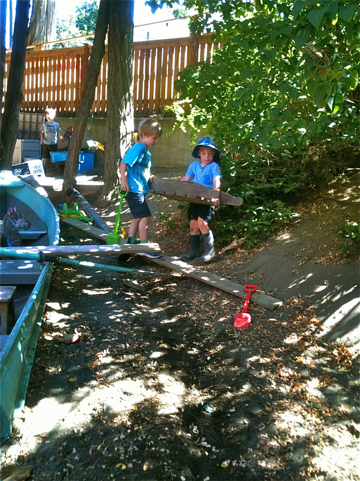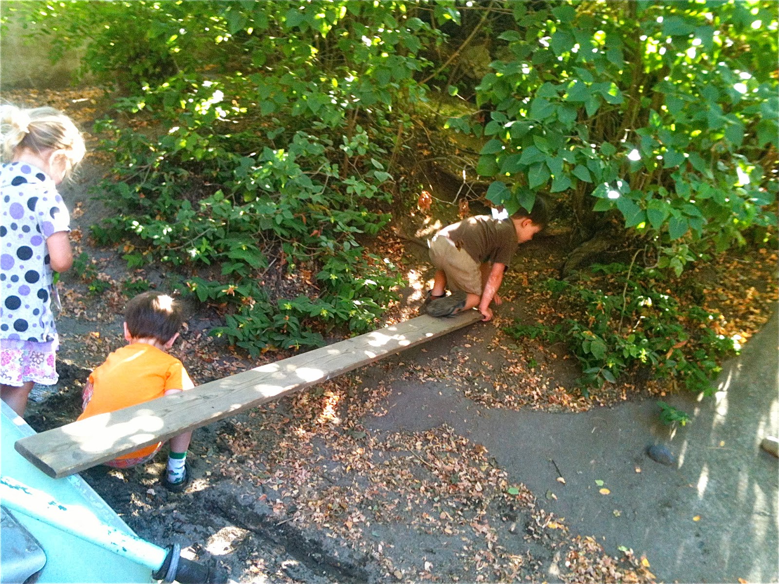 One afternoon, we dragged a plank over beside the sand pit boat and after some negotiation, made one of Woodland Park's patented seesaws by using a log as a pivot. We've been making these for three years now, a piece of institutional knowledge that continues to be passed down among the children.
