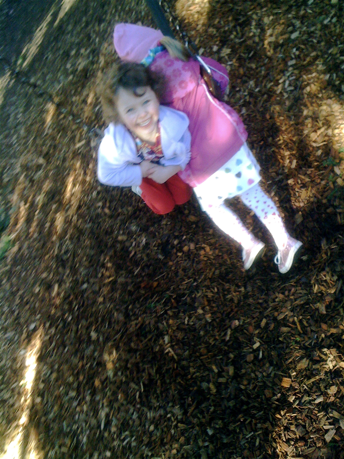 Sometimes the children will decide to share the swing, cramming two, three or four kids onto a single seat. Indeed, at Woodland Park, this solution has evolved into hanging a plank of wood between the two swings, creating a kind of bench swing upon which as many as a dozen kids can swing at once.