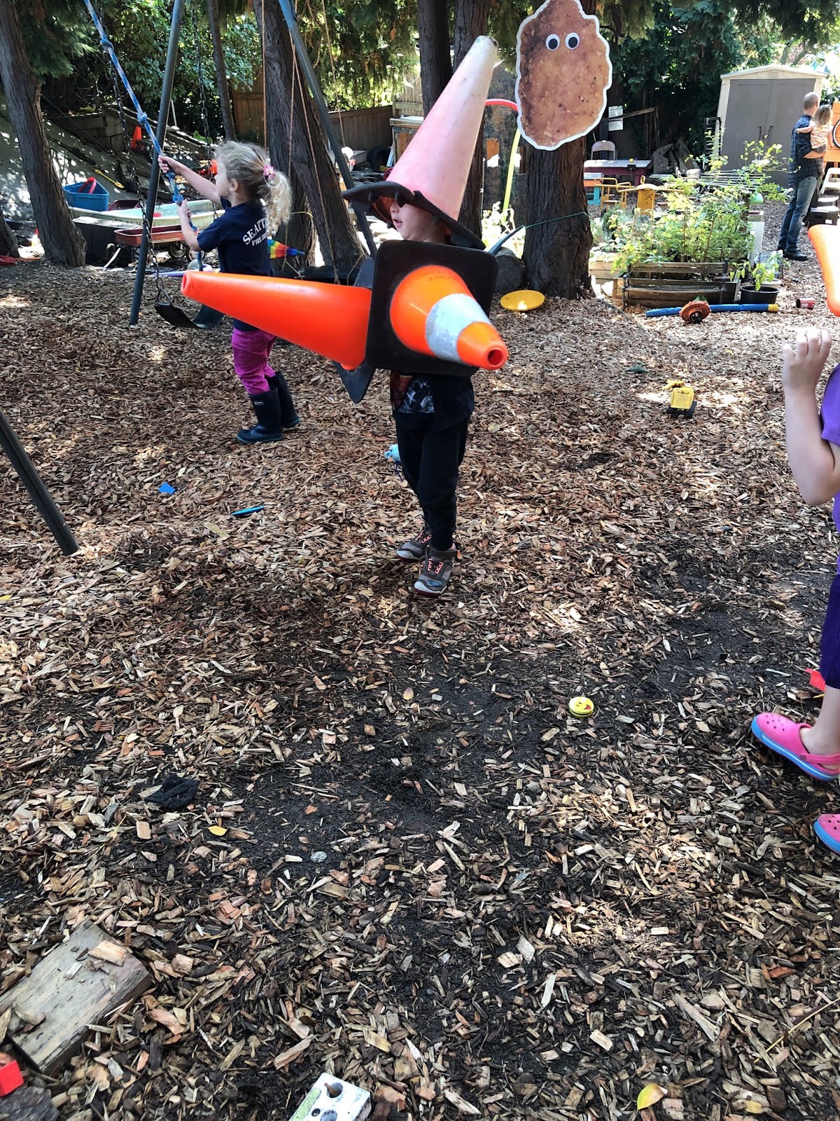 I understand why we are so quick, as adults, to jump on weapon play of this sort. It smacks of violence and other societal problems. It sometimes frightens other children. We have had school years during which it was officially banned (by a consensus of the children), but that never prevented it from happening. It just gave us adults the right to step in and scuttle it, effectively pushing it "underground." I won't pretend to explain why, but I know that this sort of play emerges all over the world wherever children play in groups of any size. I know that there has never been a connection made between this sort of play and future violence: indeed, some research seems to indicate that children who are permitted to play these games are less likely to be violent adults. I know that dramatic play is how children process what they see in the world around them, how they come to understand it from all sides, and how it can become the foundation for empathy. I also know that forbidden fruit is always the sweetest: since I've stopped being so proactive about weapons play, instead treating it like all other sorts of play, I've definitely seen a drop in the amount of time and energy children spend on these games.
